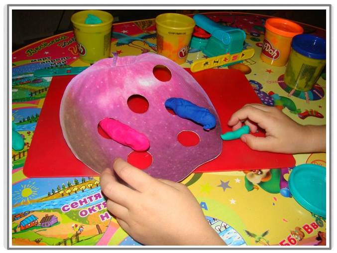 2) А еще скатывали колбаски – это были червячки. Здесь я рассказала Даше маленький стишок и мы его обыграли тоже – наши червячки делали дырочки в яблочках. А вот и сам стишок:
