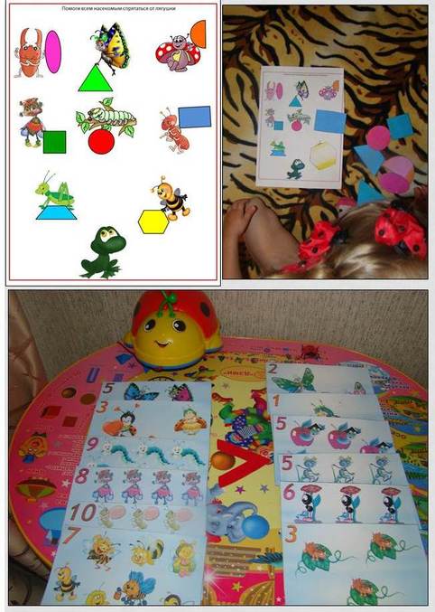 2) Математика (формы – прятали насекомых от лягушки под соответствующей формой, а потом вспоминали, кто, где спрятался; карточки на сравнение множеств- раскладывали между большой и маленькой божьей коровкой):