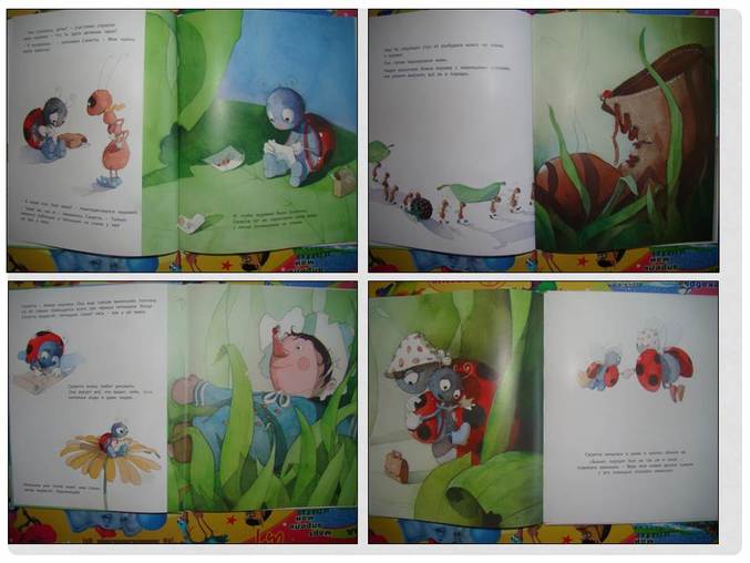 Квентин Гребан «Сюзетта ищет маму» - история про маленькую божью коровку, которая любила рисовать, однажды она потрялась и стала искать свою маму, а чтобы ее найти, нарисовала портрет своей мамы и показывала всем своим новым друзьям. В конце мама, конечно же, была найдена! История понравилась Даше.