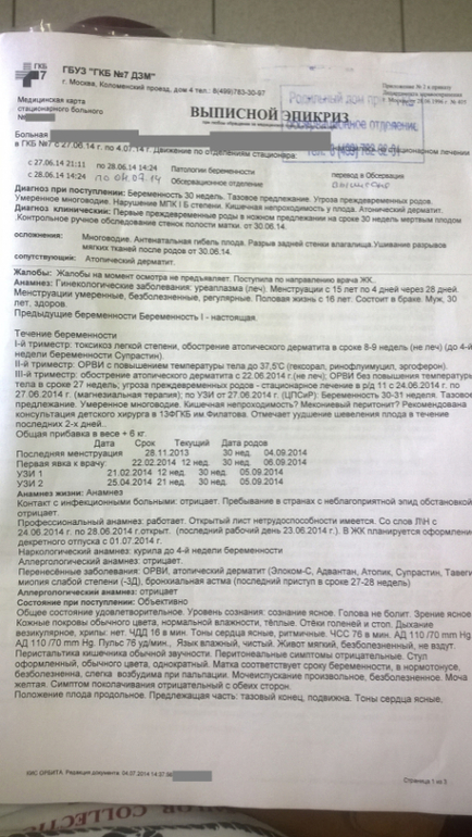 Краткая история такая: положили с тонусом матки и обменной картой в РД №11, во вторник 24 июня, на 30 неделе. Перед отправкой в ЖК делали КТГ, по комментариям отправлявшего врача КТГ нормальное. Девочка моя активно шевелилась. В РД сделали УЗИ, отправили в патологию, из нарушений только тазовое предлежание (до этого на 24 нед на скрининге лежала правильно). Жалоб особых не было кроме твердого живота и тяги. Тонус мой особо никого не волновал.