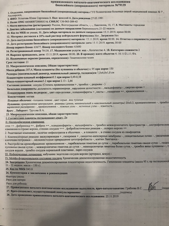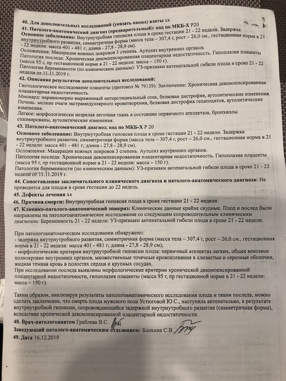Причины ЗБ и ВДорогие девушки, со мной тоже произошёл этот ад. Гибель плода на сроке 21 неделя, вызывали искусственные роды- 15 ноября. Сегодня забрала гистологию. Подскажите в чем может быть причина (к врачу только через месяц). Идти к гематологу?