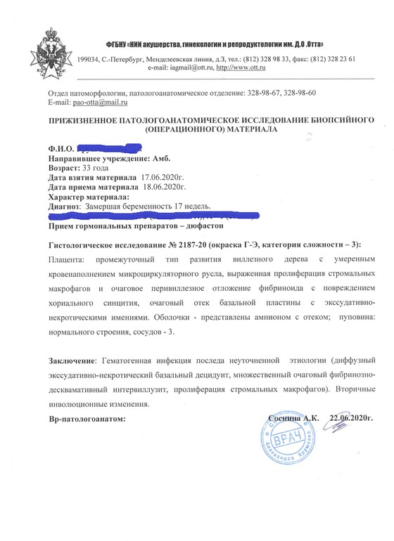 Хотя я и все врачи с которыми я обсуждала произошедшее ( а это 4 врача) еще до результатов гистологии склонялись к короновирусу, которым я переболела на сроке 14-15 недель. Вообщем то гистология это подтверждает (косвенно конечно)
