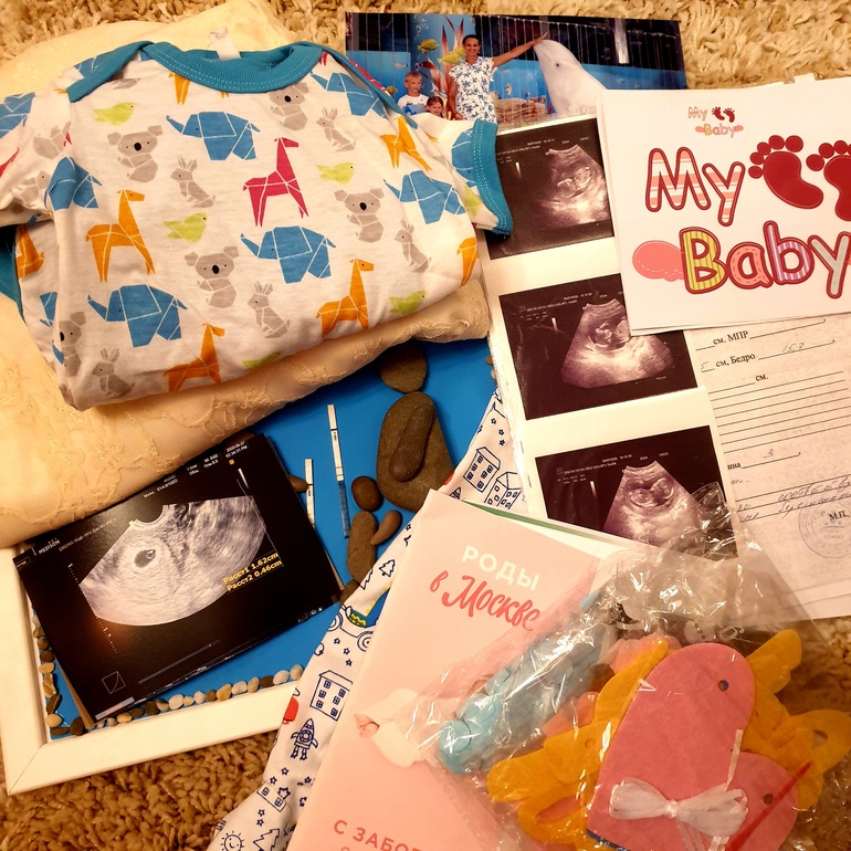 Здесь мои полосатые тесты, первые снимки узи, где сынок ещё горошинка, и другие, где уже видно, что там мальчишка; мои беременные фотографии- в семейном альбоме таких не будет, наша "картина" из гальки, первые наряды- традиция у меня такая- узнаю пол- покупаю наряд (в этот раз сразу два костюмчика купила); атрибуты для красочного определения пола- хотели взорвать шар, чтоб голубые конфети летели красивооооооо, беременное платье- так и не надела..