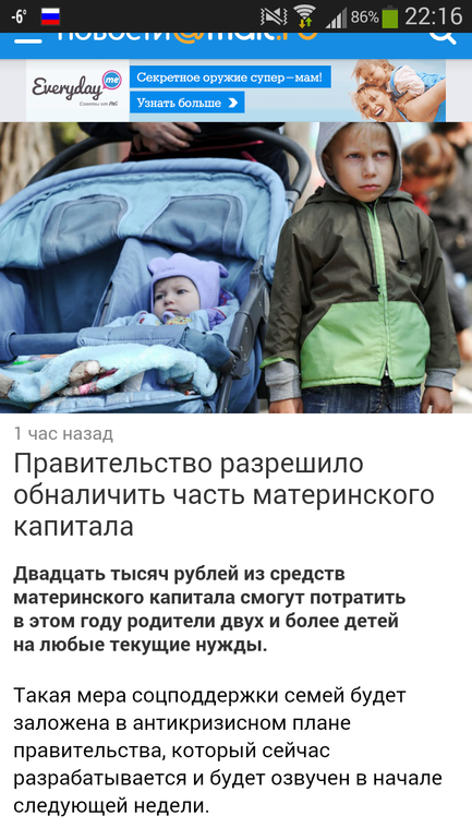 Правительство разрешило обналичить часть материнского капиталаДвадцать тысяч рублей из средств материнского капитала смогут потратить в этом году родители двух и более детей на любые текущие нужды.Такая мера соцподдержки семей будет заложена в антикризисном плане правительства, который сейчас разрабатывается и будет озвучен в начале следующей недели.Об этом сообщил первый заместитель министра труда и соцзащиты России Сергей Вельмяйкин на заседании общественного совета ведомства. Напомним, аналогичная мера соцподдержки семей с детьми действовала в России во время кризиса в 2009-2010 годах. Правда, тогда на руки выдавали максимум по 10 тысяч рублей. Теперь размер единоразовой выплаты удвоят.«Когда пять лет назад у людей появилась возможность получить наличными 10 тысяч рублей из средств маткапитала, ею воспользовались практически все, кому он положен. Единицы не пришли за выплатой», — сказал Сергей Вельмяйкин.Кстати, вчера правительство одобрило законопроект, разработанный минтрудом, который призван защитить материнский капитал от мошеннических схем.Из участия в программе маткапитала исключаются микрофинансовые организации и будет установлен дополнительный критерий для кредитных потребительских кооперативов: они должны работать на финансовом рынке минимум три года.Сейчас средства материнского капитала можно использовать на погашение жилищных займов, выданных кредитными организациями, микрофинансовыми организациями, кредитными потребительскими кооперативами и иными организациями под ипотеку.Изменения не затронут права граждан, которые заключили договор займа с микрофинансовыми организациями и кредитными потребительскими кооперативами до вступления в силу предлагаемых изменений.А вот что касается индексации маткапитала и других социальных выплат, пока неизвестно, насколько они увеличатся в этом году — экономические расчеты на этот счет еще ведутся. Единственное, о чем можно сказать с четкой определенностью, это о том, что трудовые пенсии с 1 февраля вырастут на 11,4 процента — на уровень реальной инфляции по итогам прошлого года.На это дополнительно будет выделено 188 миллиардов рублей, правда, пока еще до конца неизвестно, из какого именно источника будут взяты эти деньги. По словам Сергея Вельмяйкина, скорее всего — из Фонда национального благосостояния.Еще одна тема, обсуждавшаяся на заседании общественного совета минтруда, — надо ли делать 31 декабря выходным днем, чтобы люди могли как следует подготовиться к праздникам. С такой инициативой выступают члены Общественной палаты. Однако ни ведомство, ни члены общественного совета при нем с инициативой не согласны.«Подобные предложения стали появляться после того, как в России появились новогодние каникулы. Когда люди отдыхали на Новый год только 1 января, а потом 1 и 2 января, не возникало предложений сделать 31 декабря нерабочим днем», — сказала директор департамента оплаты труда, трудовых отношений и социального партнерства Минтруда России Марина Маслова.По ее словам, 30 процентов работающих трудятся в сфере обслуживания населения. Они в любом случае будут работать как 31 декабря, так и в последующие праздничные дни.Источник: «Российская газета»ТАМ ЖЕ НЕ НАПИСАНО ПРИХОДИТЕ И СРАЗУ ДАДИМ — НАПИСАНО В ЭТОМ ГОДУ !!!!!