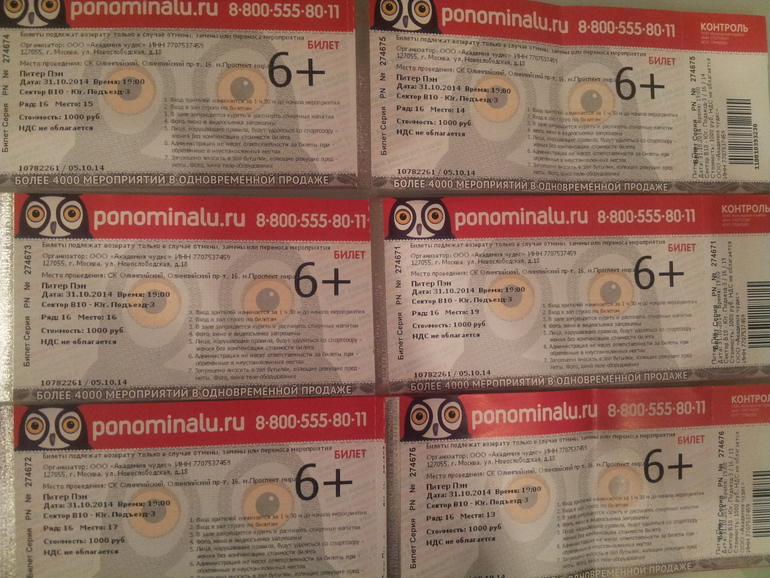 Помогите вернуть деньги за билеты. Мною, как представителю родительского комитета 1 класса были куплены билеты в количестве 6 штук на шоу "Питер Пэн" в СК "Олимпийский" г. Москва у билетного агента ponominalu.ru Организатором данного мероприятия является ООО «Академия чудес»: ОГРН 1057746014523 ИНН 7707537459 Юр. адрес: 127055, г. Москва, ул. Новослободская, д. 18.