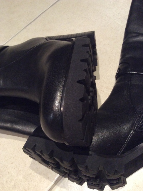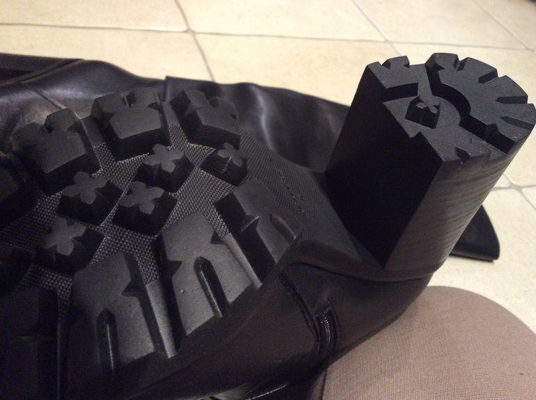 Я когда выбирала сапоги, первыми мерила другие, итальянские. И меня смутило то, что они все были в потертостях, царапинах. Я еще подумала, что стоЯт они здесь явно очень давно уже. А на этих не заметила "ношенность". Может, на фоне тех мне эти показались идеальными. Вот теперь думаю, а что если их действительно кто-то поносил и сдал. Кстати, по подошве не скажешь, что сапоги были на улице. Мне так кажется. Я, конечно, не эксперт. Следы примерки. Но каблук... причем это только на одном сапоге. На втором совсем чуть потертости. Видимо, этот сильно потертый на витрине стоял.