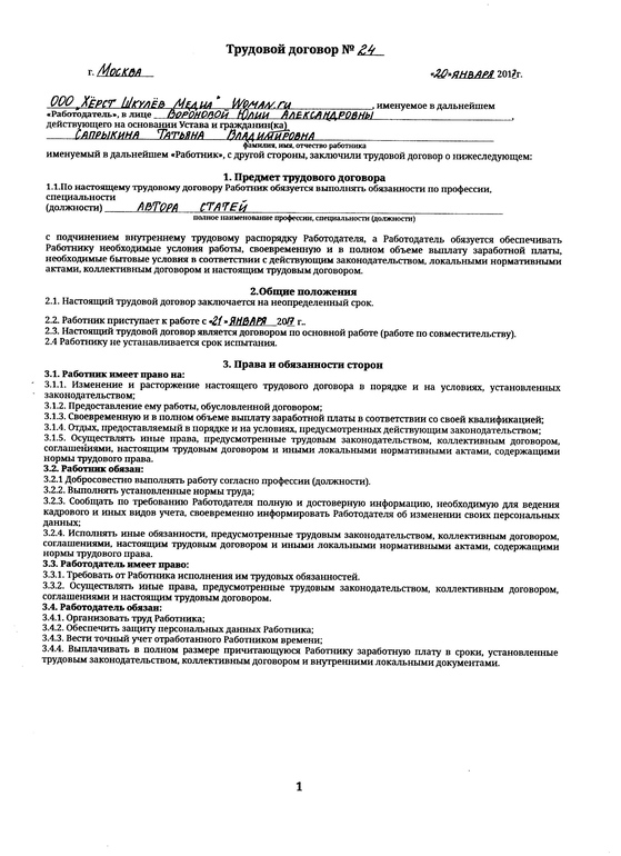 Ситуация такая: 21 января я заключила трудовой договор для работы в качестве удаленного сотрудника(автора статей для известного портала). Оклад 45 т. р.(так и написано) плюс надбавки за работу в выходные дни. Без испытательного срока. Взяли меня на работу после пробного задания, которое я выполнила хорошо(мне так сказали).