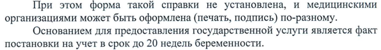Итак, вместе с больничным по БиР мне дали справку о постановке на учёт до 20 недели. На справке стояли прямоугольная печать мед. учреждения, треугольная для справок и печати врачей. На mos.ru подала заявку на выплату, приложила скан, саму справку отнесла в МФЦ - почему-то там по номеру заявки ничего не нашли, но справку взяли, и я попросила мне дать копию со штампом, что справка принята (это без проблем). Пришёл отказ: