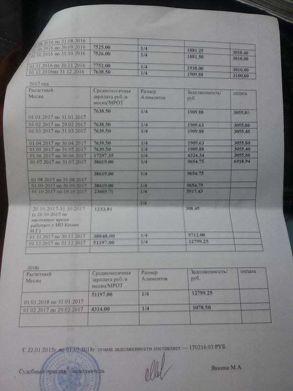 Семейное (развод, алименты, раздел имущества)Добрый день, уважаемая публика ББ! Продолжаю готовиться к лишению РП БМ. Получила от пристава расчет задолженности за последние три года. Фото прилагаю этой портянки. Как рассчитывать неустойку если периодически производится оплата, но на общую картину они никак не влияют и долг продолжает расти? И неустойку я могу взыскивать только за последние 3 года или с момента возникновения долга(последний раз весь долг закрывал в 2013 году для продажи недвижимости на которое были наложены ограничение регистрационных действий, а дальше долг продолжил перманентно расти)?
