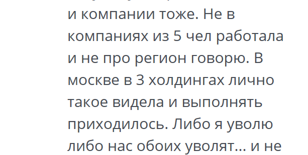 Если там где вы работаете такого нет, это не значит что в других местах тоже нету...случаи разные бывают и компании тоже. Не в компаниях из 5 чел работала и не про регион говорю. В москве в 3 холдингах лично такое видела и выполнять приходилось. Либо я уволю либо нас обоих уволят... и не раз про такое слышала о других местах )) на какую компани работает автор поста не известно и говорить что ее всегда и за все по головке гладить будут не стоит. Ей потом в случае чего без работы сидеть и искать другую работу с плохими рекомендациями, пока вы спокойно на своем месте сидите со своим взглядом на жизнь и розовыми пони, да не в обиду сказано...
