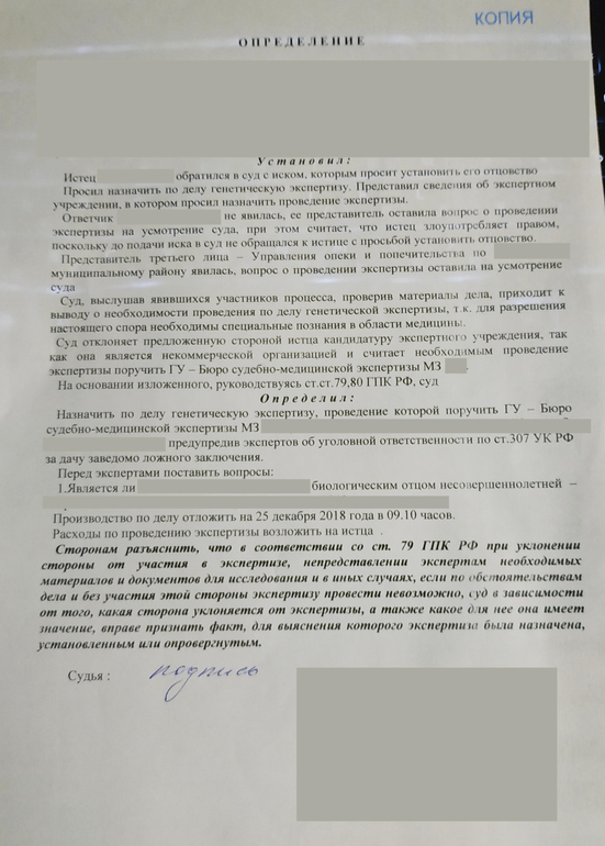 В иске указано, что мать не отрицает его отцовства, есть скриншоты из соц.сетей об этом, а также фотографии с дочерью в разные периоды её жизни и чеки о том, что он помогает ей материально за последние 3 года. На первом слушании ответчица не присутствовала, судья попросила уточнить исковые требования по общению с ребенком (иск составляли сами, получилось действительно криво). На втором слушании была уже представительница ответчицы, попросила справку с места работы о доходах, мол, обеспечит ли отец ребенку достойное передвижение/времяпровождение, а судья ввиду того, что самой ответчицы на суде не было, сказала на следующем слушании ходатайствовать об экспертизе. На третьем слушании муж ходатайствует об экспертизе, на что представительница (снова без ответчицы) предоставляет бумагу о том, что ответчица не против признать его отцом, на основании чего суд выносит решение: либо экспертиза, либо мирном путём через загс, но в случае экспертизы вы делаете её за свой счет и не сможете требовать расходы с ответчицы. Причём она отказала в предоставленною им организацией (потому что некоммерческая) и назначила свою (государственную), при этом никакого письма от лица суда в организацию не направив, тем самым возложив сложности о проведении экспертизы на его плечи.