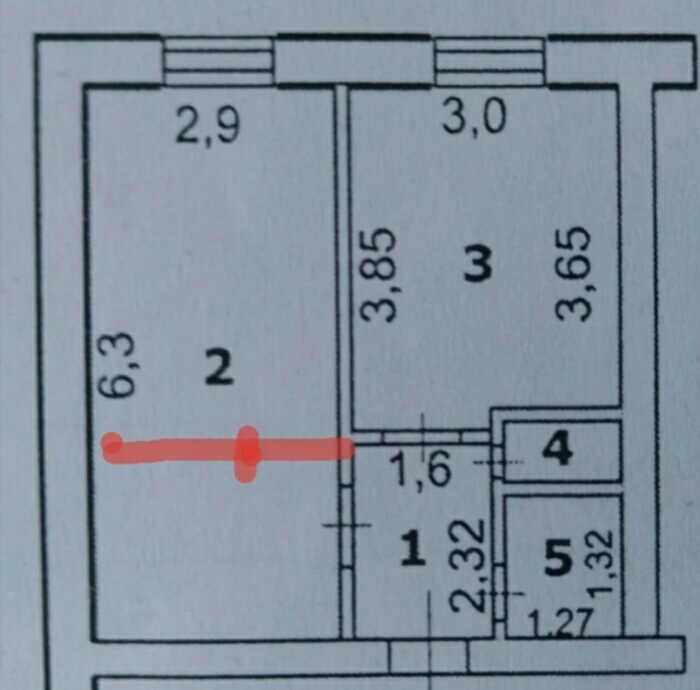 Где красная линия- неузаконенная гипсокартоновая стена.