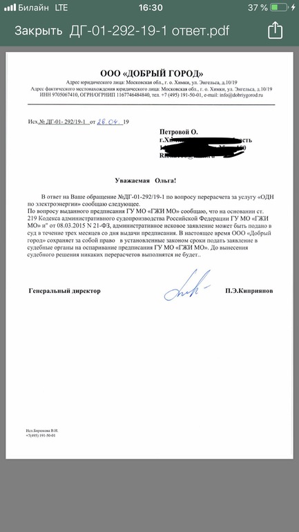 Жилищное (оформление, прописка, приватизация)Здравствуйте. Зимой заметила очень ощутимую прибавку в квартирной оплате , и выяснила , что у/к начислила нам какой-то несуществующий долг за ОДН за 16 и 17 года . Прекрасно понимая, что это какая-то фигня и произвол , написала в инспекцию с просьбой провести проверку . Они, естественно , вынесли предписание нашей управляющей компании сделать перерасчет. А сегодня получаю вот такое вот письмо , где конкретно посылают на хрен.. Как действовать ?