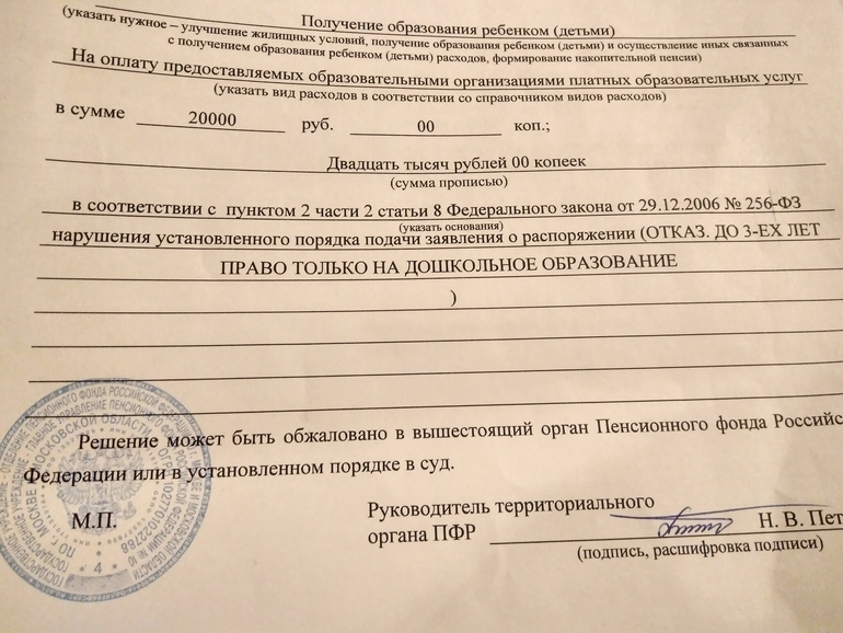 Почему не приняли? Даже если есть ошибка, то попросят переписать. Вот и как потратить этот маткапитал, скоро деньги вообще обесценятся.