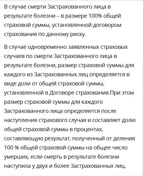 "В случае смерти Застрахованного лица в результате болезни - в размере 100% общей страховой суммы, установленной договором страхования по данному риску.