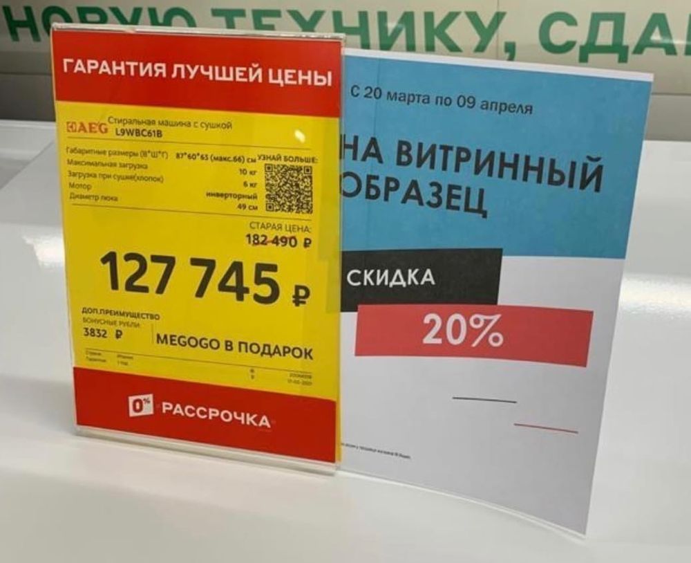 РазноеДобрый день! В магазине (да и в сети в целом) куплен последний (витринный) экземпляр, непосредственно на нем вот такой ценник. Не дали обещанный megogo в подарок. Прав ли продавец, отказывая в megogo по причине того, что применена указанная справа на голубом ценнике скидка 20%? Ибо зачем указывать megogo, почему бы просто не перепечатать ценник, если товара не витринного в наличии уже давно нет и остался лишь витринный?