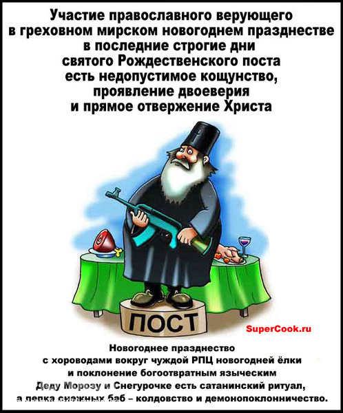 Для истинно верующих православных светский «новый год», справляемый во дни святого Рождественского поста, есть празднество чуждое, также как воистину чужды людям православным сопутствующие сему нехристианскому празднеству языческое наряженное дерево, глумливые увеселения под ним в строгие постные дни и почитания изображаемых актерами ложных языческих духов Деда Мороза и Снегурочки.