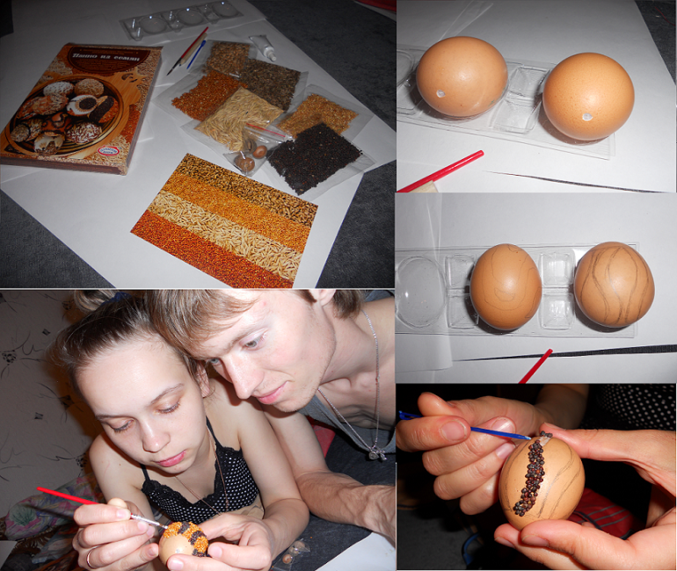 Ну и о традициях нашей Пасхи, решили с мужем каждый год делать писанки разнообразных видов, и решили начать с обклейки зерном