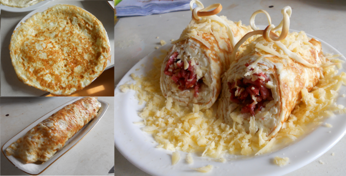 немножечко похвастаю=)))) мой муж повар и частенько балует меня различными деликатесами, основным блюдом нашего стола он выбрал рулет из омлета с ветчиной и сыром….вообще он имеет свое название, но я его не знаю…. вы даже не представляете как он готовится….это супер…и очень сложно….блины из омлета очень нежные и рвутся при прикосновении, а он из них еще и рулет сделал….что рассказывать смотрите сами