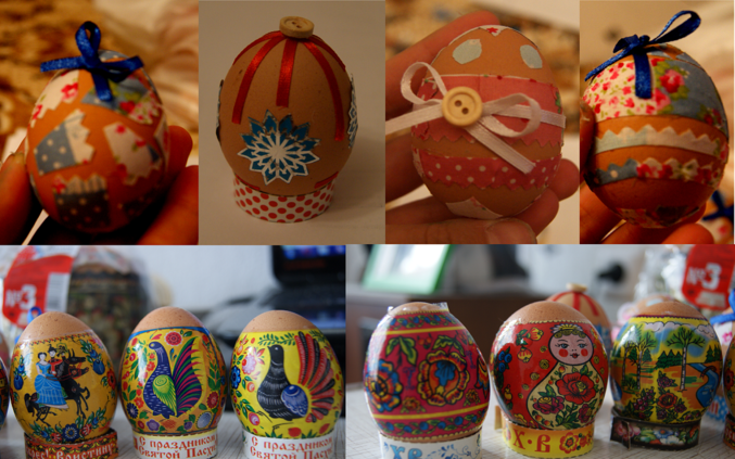 хотелось чего то особенного ведь это первая наша совместная Пасха, поэтому обошли мы кучу магазинов и столкнулись с большой проблемой – нигде нет белых яиц…. делаю первую галочку себе в блокнотик «стоит покупать яйца за неделю»….. к счастью на стелажах я нашла кучу идей как украсить бурые яйца=))))….. выбрала обклейку тряпочками и термопленку….. термопленка это чудо, буквально 2 сек и обычные яички становятся красочными=))))….а вот если вы решите повторить мой подвиг с обклейкой яичек, то запаситесь временем и терпением=))))….. результат, прошу не судить меня строго