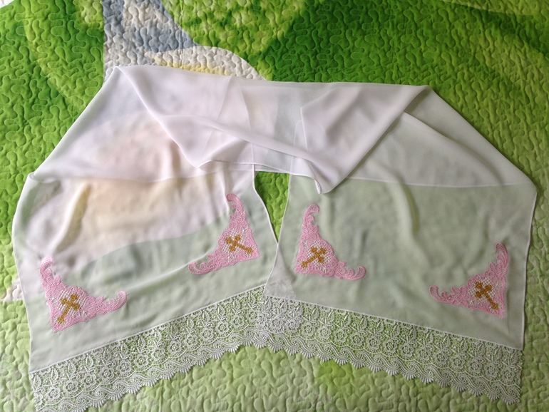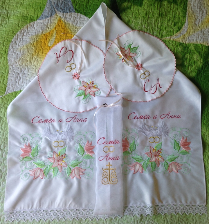 Венчальные аксессуары-это рушники (подножка, союзный или для икон), салфетки для свечей, венцов и колец с монограммами, а также мешочек для упаковки и хранения аксессуаров с монограммами и датой венчания, платки, косынки, пелерины ручной работы.