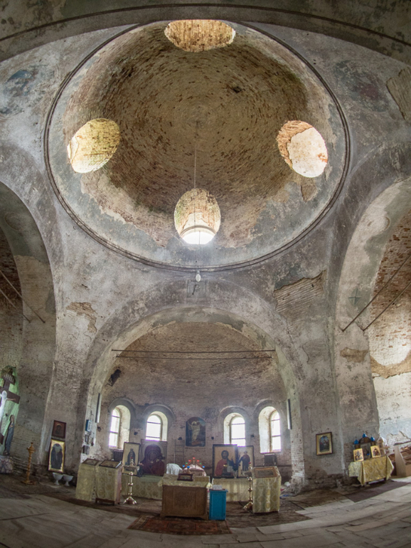 85 лет не проводилось служб, но благодаря тому, что в храме хранили зерно (то есть следили за кровлей), он не разрушился, и даже сохранились фрески частично.