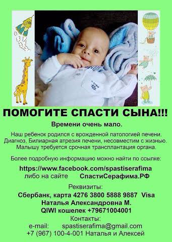Здравствуйте! Я хочу обратиться к вам с просьбой о помощи моему маленькому крестнику. Ему сейчас 5 месяцев, его зовут Серафим и у него билиарная атрезия печени плюс куча сопутствующих диагнозов. Диагноз несовместим с жизнью, малышу требуется пересадка печени. Скорее всего операция будет проводиться в Бельгии. Сумма, необходимая для проведения трансплантации печени, огромная. На данный момент родители смогли собрать примерно четверть от необходимой суммы. Месяц назад врачи предполагали, что у Серафима есть 2-4 месяца стабильного состояния, но на данный момент анализы резко и значительно ухудшились, а это значит, что счет пошел на недели.