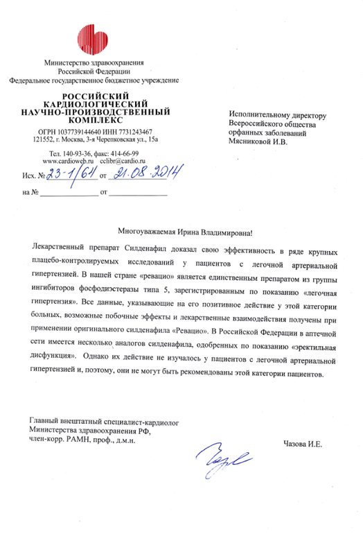 Олечка ,спасибо за внимание к моей проблеме.Этот вопрос обсуждался с кардиологами и в повседневной жизни пациэнтов с такой же болезнью ЕДИНСТВЕННЫЙ ПРЕПАРАТ ДЛЯ ЛЕЧЕНИЯ ЛЕГОЧНОЙ ГИПЕРТЕНЗИИ ЭТО РЕВАЦИО.Есть документальное подтверждения врача по этому поводу.Дабы не навредить ,стоит рассматривать только его...Об этом можно спорить бесконечно,но когда твоя жизнь зависит от качества препарата,рисковать страшно....