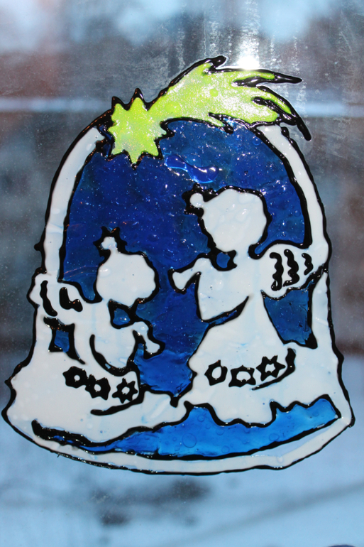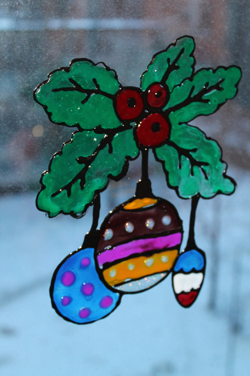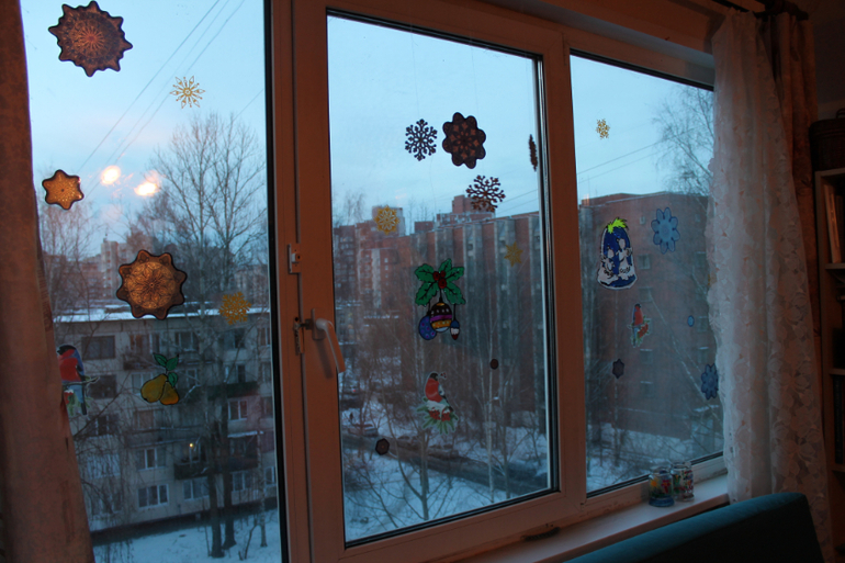 Во второй день нам предлагалось сделать снежинки на окно и перевести их зубной пастой. Т.к для нас это был первый опыт по переводу снежинок зубной пастой, то конечно же он оказался не очень удачным. Паста очень не красиво высохла и на следующий день мы её смыли. Окна украсили по другому, Ульяна с папой сделали картинки витражными красками и наклеили их на окно.И еще мы приклеили снежинки.