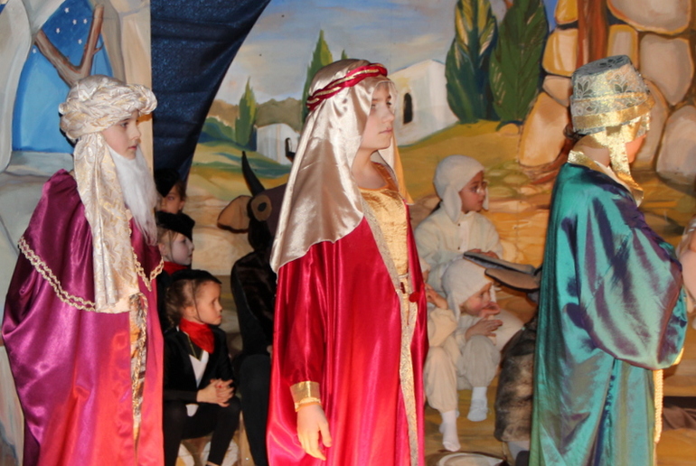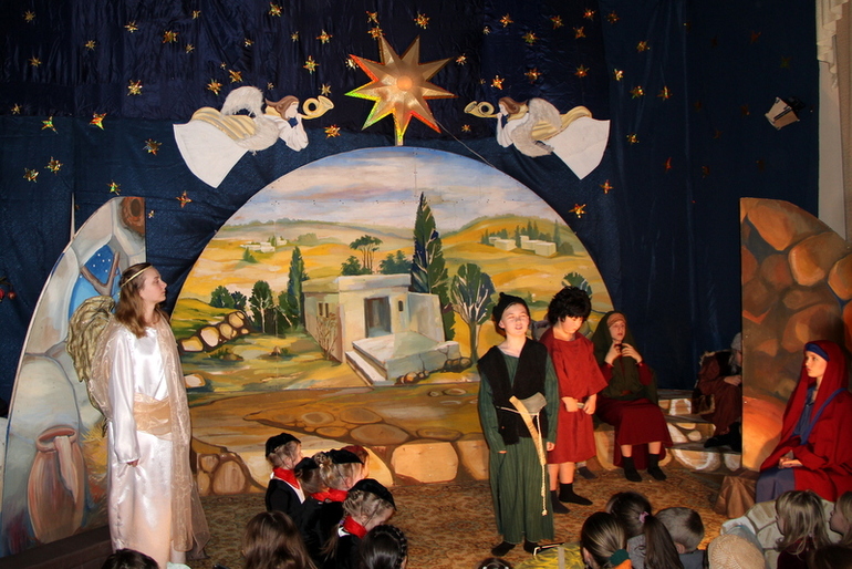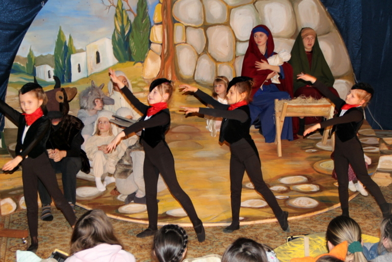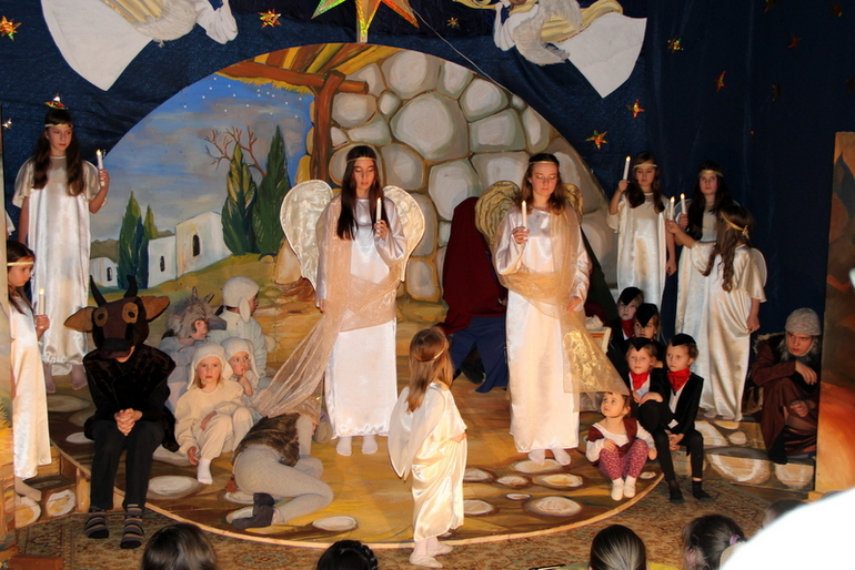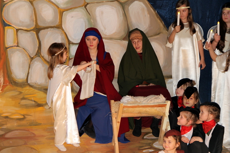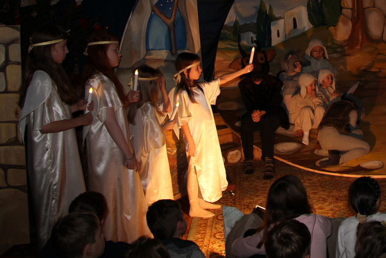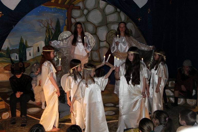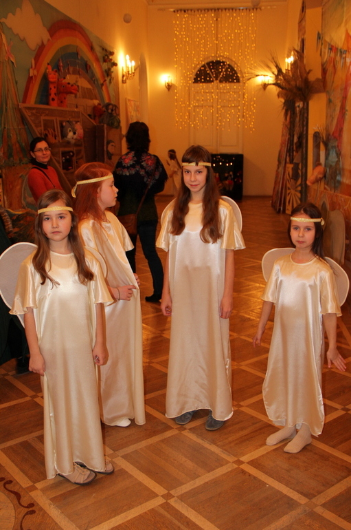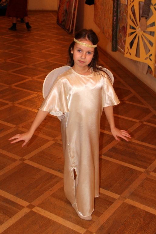 Саша изъявила желание быть ангелом славословящим (это ее давняя мечта). Были еще "большие" ангелы (они рассказывали всю историю и меняли декорации), святое семейство и куча животных и птиц. В общем, задействовали всех детей, кого только поймали нашли в храме. Животные общались между собой, птицы танцевали, ангелы красиво ходили. И да... шествие ангелов - это самое интересное действие во всем спектакле. Это совсем не потому, что там моя дочка тоже ходила. Нет, ну правда ))) Свет выключен, ангелы зажигают свечи и начинается по истине волшебное действие под прекрасную музыку. Еще в этот самый сокровенный момент, за спинами ангелов, в мир приходит Младенец. Очень трепетно все это.
