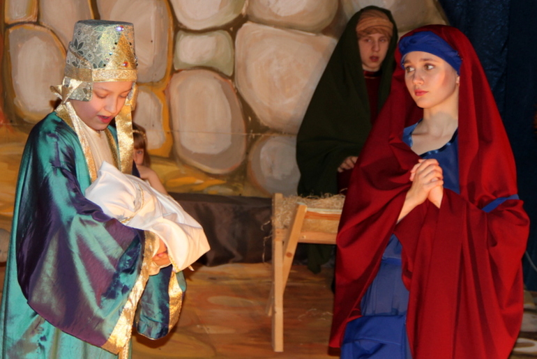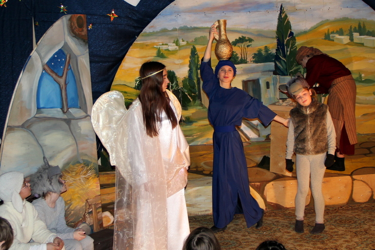 Актеры все молодцы. Волхвы шикарные. Мария изумительна. Если мой муж когда - нибудь смонтирует видео ))), обязательно выложу кусочек с ангелами. Пока могу поделиться несколькими фото. Их немного. Я снимаю с Тимошей. Он сидит в хипе, а я одной рукой пытаюсь управиться с довольно увесистым фотоаппаратом. Конечно, еще и мест в "партере" нам не видать. Так, что хороших ракурсов почти нет. Но, все же...
