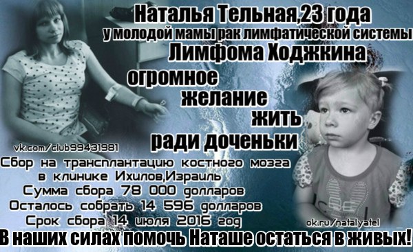 Меня зовут Наталья Тельная из г. Харькова, мне 23 года. Я молодая мама: моей дочке Вике 4 года. У меня есть муж Роман. И у меня Лимфома Ходжкина (злокачественная опухоль лимфоузлов, впоследствии перекинувшаяся на лёгкие). Уже 3 года я ношу это бремя, и, засыпая каждую ночь, на утро боюсь не проснуться. За это время я прошла 12 сеансов химио- и 5 сеансов лучевой терапии, 4 курса иммунотерапии и сейчас прохожу пятый… Моя жизнь превратилась в непрекращающуюся борьбу за существование.