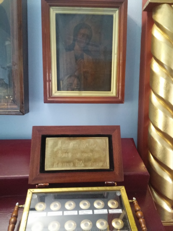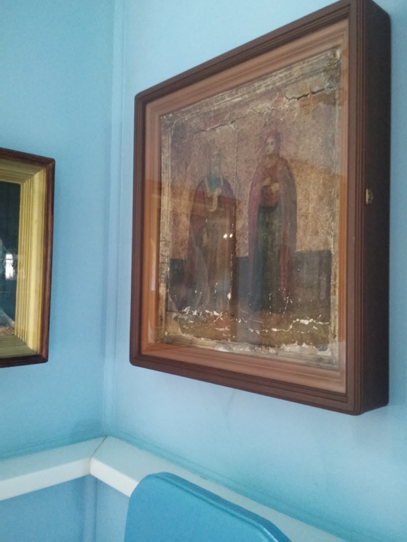 Рядом - редкая икона Богородицы с непокрытой головой. Найдена она черной доской, лик проявляется со временем.