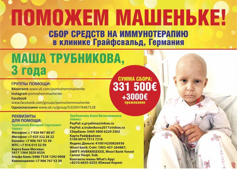На данный момент Маша проходит Высокодозную химиотерапию с аутотрансплантацией стволовых клеток (ТСКК) в Клинике "Северанс", Южная Корея. Ранее основное лечение получала также в Южной Корее. На 100-й день после проведения ТСКК, необходимо дальнейшее лечение в виде ИММУНОТЕРАПИИ, которую согласились провести лишь в одной Клинике - Грайфсвальд, Германия. После обследования мы снова будем подавать документы в другие клиники с целью найти клинику дешевле.