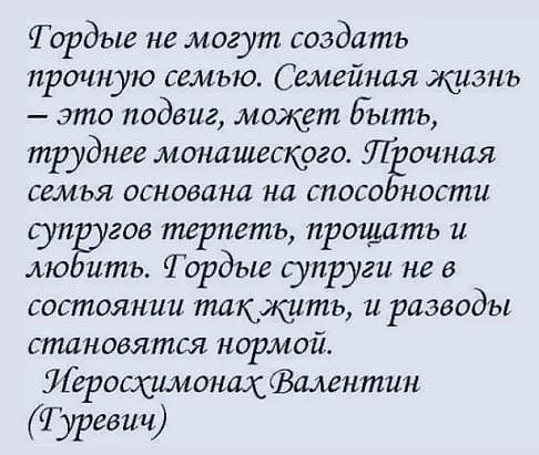 Конечно с одной стороны это верно, в браке всегда нужно уметь уступить, принять какие-то недостатки друг другу, но с другой стороны, я очень не люблю подобные цитаты вырванные из общего контекста, без дополнительных комментариев. Нужно обязательно пояснять что терпеть и прощать до РАЗУМНЫХ пределов. В России, к сожалению, семейно насилие пока цветет пышным цветом. Женщины-жертвы и так находятся под прессом страха, комплексов и прочего, а тут еще и батюшка такое говорит, значит нужно своего мудака терпеть и дальше, бьет, значит любит, как же детей сиротить и т.д. Я высросла в семье где мама была вот такой жертвой. Я до сих пор расхлебываю комплексы полученные в детстве. До сих пор не могу простить своего отца за то, что он фактически лишил меня нормальной адекватной матери. Поэтому очень остро и негативно отношусь к подобным призывам. Считаю что их нужно "выдавать" очень осторожно и с пояснениями.