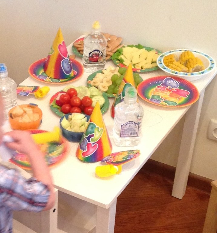 И большой стол для родителей (горячее дети будут есть за общим столом). Детскую комнату отведем под игровую, там есть телевизор ( если устанут можно мультики включить), игрушки и включим машину с мыльными пузырями ( так же по опыту прошлого года, дети были очень довольны и с радостью ловили пузыри)).