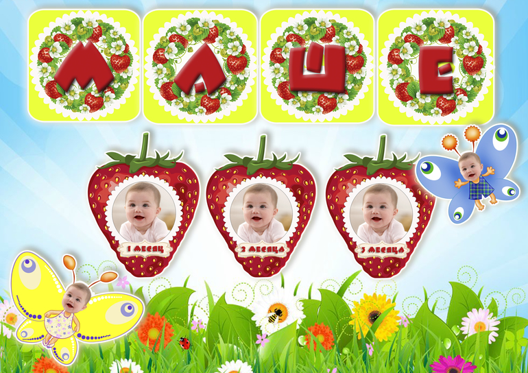 В состав набора вошли: растяжка-ягодки "12 месяцев", растяжка, колпачки. поздравительная телеграмма, анкетки для гостей и конверт, бабочки с фото малыша. Состав набора может меняться и дополняться другими элементами, все зависит только от вашего желания!