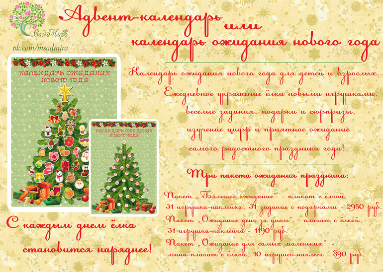 Два пакета ожидания праздника: мини-пакет "Ожидание для самых маленьких" - малышам еще трудно ждать долго, поэтому для них приготовлены 10 наклеек-игрушек для украшения елочки; пакет "Ожидание день за днем" - набор для более взрослых деток, которые могут проследить весь декабрь в числах, украшая елку 31 наклейкой, вместе с этим, ребенок изучает цифры, и видит визуально сколько осталось дней до праздника.