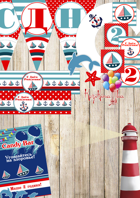 Аксессуары для Украшение праздникаНовый набор в морском стиле для девочек, и можно для мальчиков. На фото в набор вошли растяжка, фуржака моряка, топперы и фигурные топперы, наклейки на сок, мини плакатик кенди бар. Собираюсь дальше делать колпачки, обертки на кексы и шоколадки, топпер на торт, меловой плакат, пригласительный, этикетка на шампанское. Все в этом же стиле.