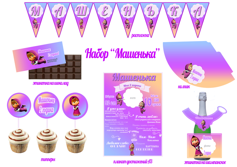 Детский ПраздникА кто не любит Машеньку? Её любят все, взрослые и дети. Этот мультфильм покорил многие сердца телезрителей. Машеньку хотят видеть везде и повсюду. И праздник хочется тоже с Машенькой. В состав набора входят: именная растяжка, колпачки, этикетки на шоколад и шампанское, топперы и плакат достижений. Набор может быть дополнен любыми элементами. Больше работ в группе в одноклассниках
