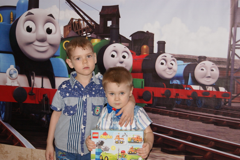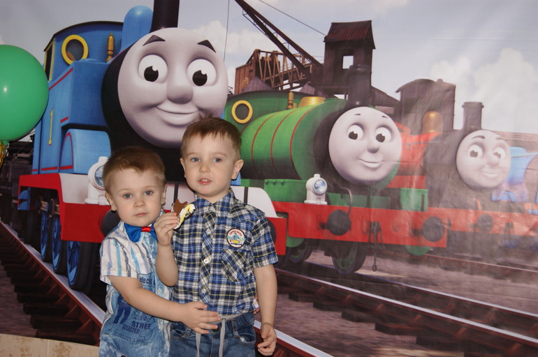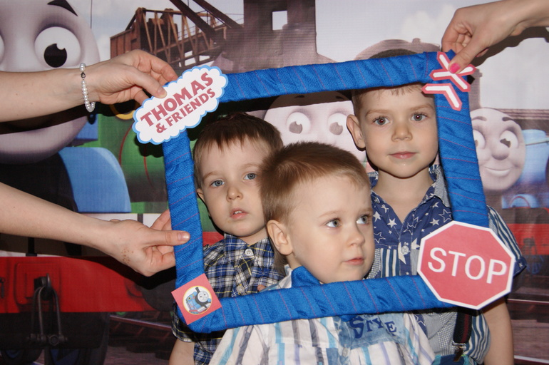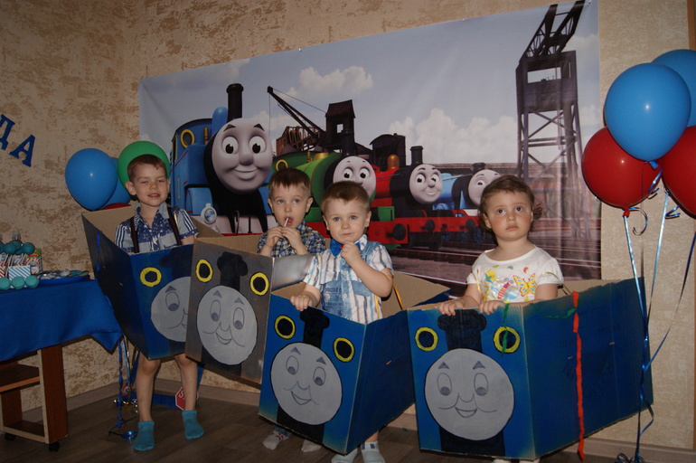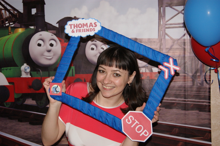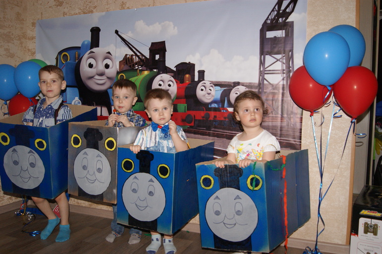 На стену распечатывали баннер с паровозиками для фотозоны.