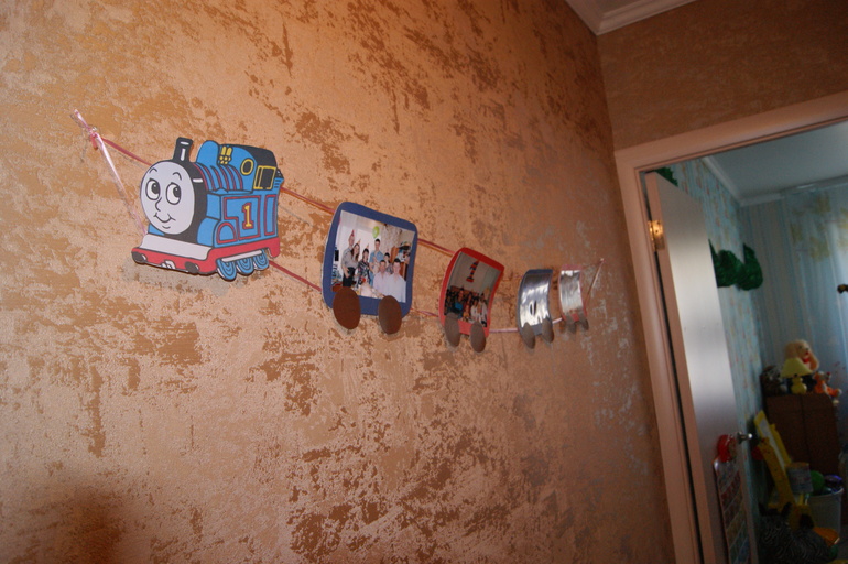 Делала паровозик с фотографиями с прошлых дней рождения (1 месяц, год,два)