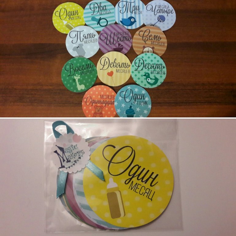 Рисунки на наклейках и цвет фона разный, что позволит вам каждый месяц выбирать различного цвета одежду для памятных фотографий и не быть "привязанным" к одному цвету :)