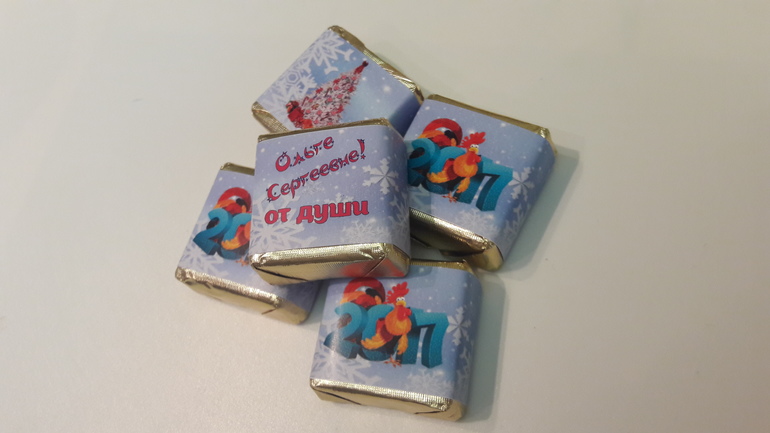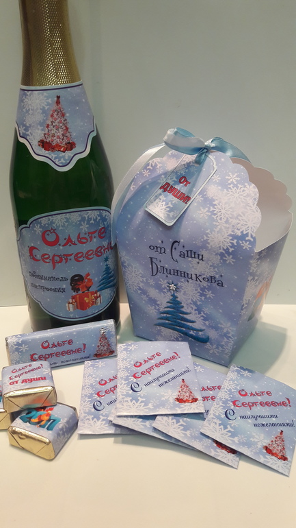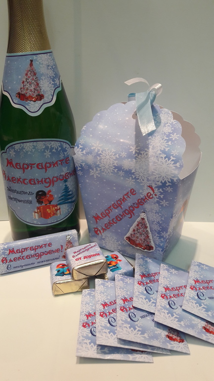 Именное Шампанское, именные коробочки с бирочками, именные пакетики с чаем, конфетки в тематике праздника и именные шоколадки с пожеланием внутри!