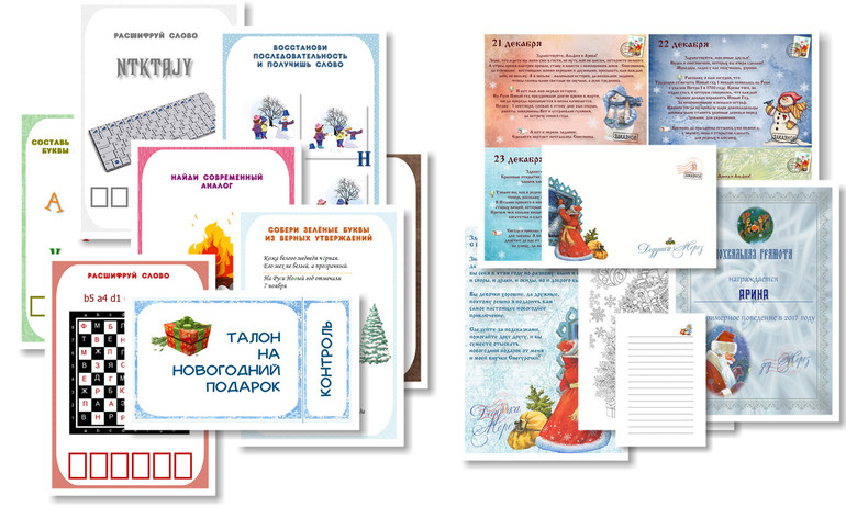 Каждый год добавляю новые задания-подсказки, все опробовано на собственных детях разного возраста - неудачные задания убираю, оставляю те, которые занимают не очень много времени и удерживают внимание. Цена - всего 200р. и вы получаете квест в электронном виде и можете распечатать его дома.