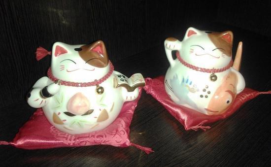 Манэки-нэко (яп.  буквально «Приглашающий кот», «Манящий кот», «Зовущая кошка»; также известный как «Кот счастья», «Денежный кот» или «Кот удачи») — распространённая японская скульптура, часто сделанная из фарфора или керамики, которая, как полагают, приносит её владельцу удачу. Скульптура изображает кошку с поднятой вертикально лапой, и обычно выставляется в витринах магазинов, в ресторанах, комнатах патинко, на складах и в других местах. Кошка, поднявшая правую лапу привлекает деньги,удачу, а поднявшая левую лапу — клиентов. Встречаются также «Манэки-нэко» с двумя поднятыми лапами. ©  Вот два моих котика.
