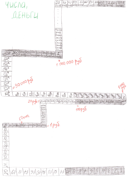 Интересно, что деньги я тоже располагаю на этой схеме. Но в тот момент, когда я начала их располагать, в ходу еще были тысячи и сотни тысяч. Потом их деноминировали (отрезали три нуля), но своего местоположения в моей голове они у меня не поменяли. Поэтому и сейчас рубль у меня располагается там, где раньше была тысяча, а 50 копеек там, где находится цифра 500.