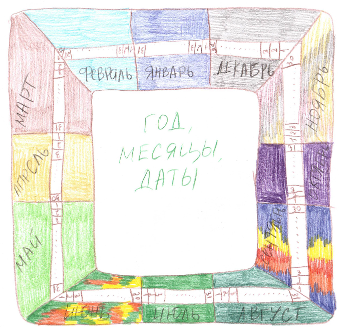 Здесь постаралась закрасить в тот цвет, которым приблизительно вижу каждый конкретный месяц. Пока не начала рисовать, никогда об этом не задумывалась. А вот сегодня поняла, что и цвет в моей голове присутствует)))