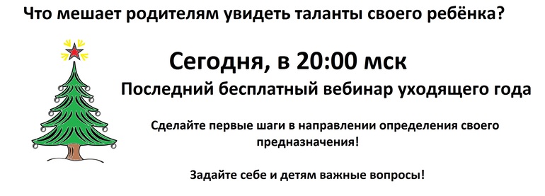 Сегодня вечером, в 20:00 мск, состоится последний бесплатный вебинар 2015 года о предназначении, призвании, талантах и способностях Ваших и Вашего ребёнка.