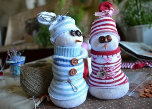 Вам понадобятся детские белые гольфы (или колготки), носки с цветным рисунком, пшено, стержень от оранжевого карандаша (из него делаем нос-морковку), иголки и нитки, пуговицы.